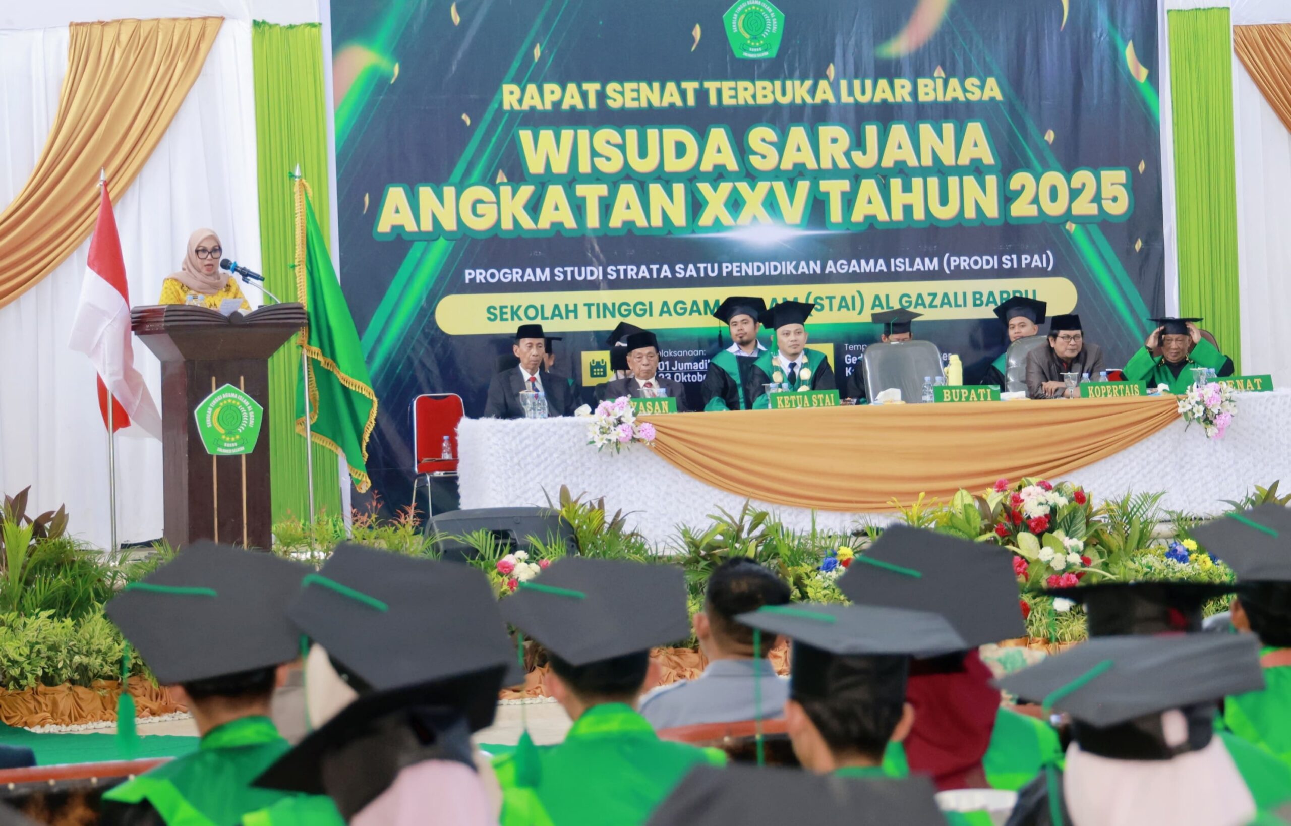 BARRU, ONLINEKASUS.COM — Bupati Barru, Andi Ina Kartika Sari, SH., M.Si., menghadiri Wisuda Sarjana Sekolah Tinggi Agama Islam (STAI) Al Gazali Barru untuk Program Studi Strata Satu Pendidikan Agama Islam (S1 PAI) yang digelar di Gedung Islamic Center Kabupaten Barru, Kamis (23/10/2025).