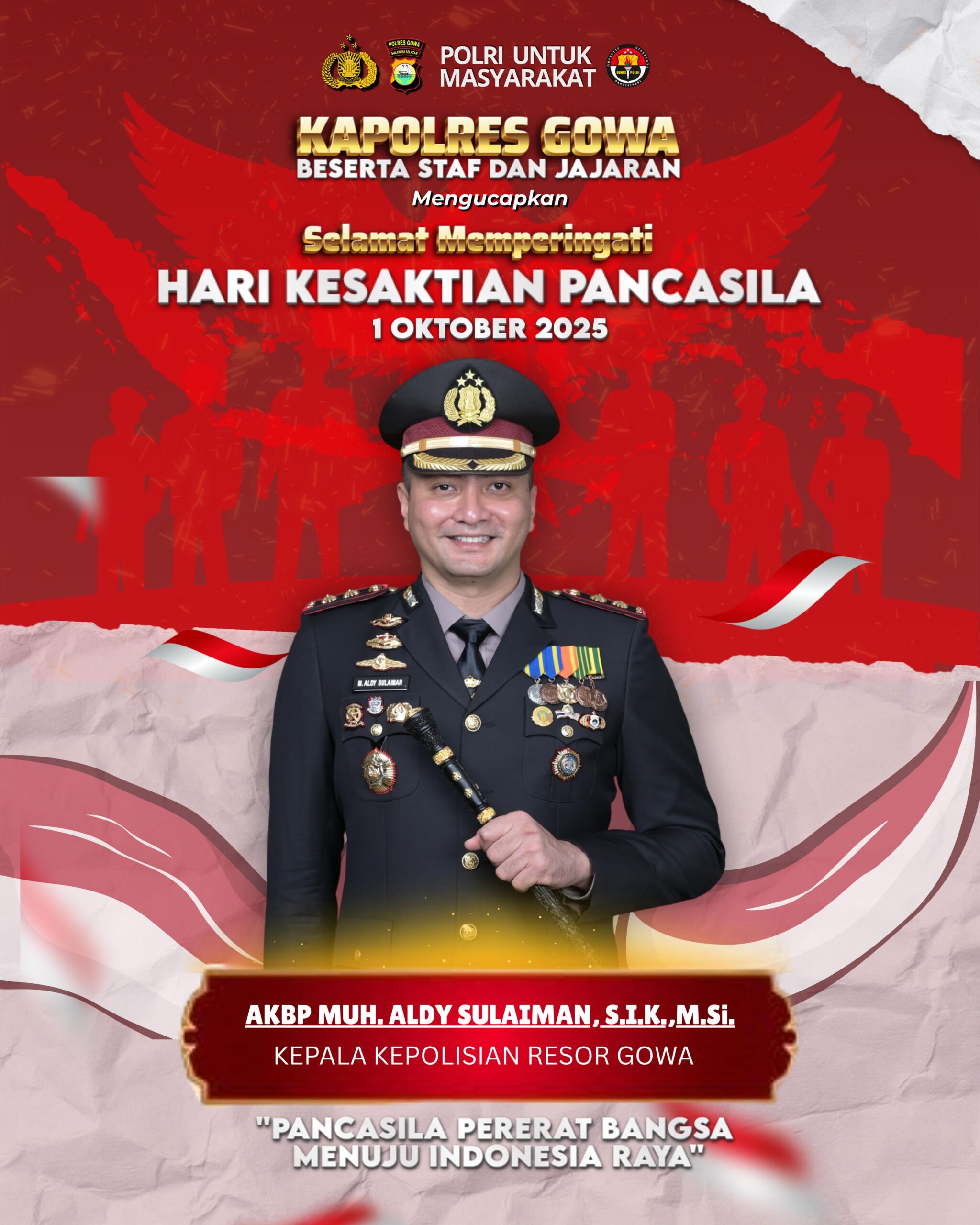 GOWA, ONLINEKASUS.COM — Kapolres Gowa, AKBP Muh. Aldy Sulaiman, S.I.K., M.Si., bersama seluruh staf dan jajaran Polres Gowa menyampaikan ucapan Selamat Memperingati Hari Kesaktian Pancasila yang jatuh pada 1 Oktober 2025, Rabu (1/10/2025).
