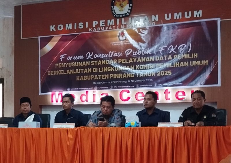 Dalam hal ini Komisi Pemilihan Umum Daerah (KPUD) Kabupaten Pinrang menggelar Forum Konsultasi Publik (FKP) Penyusunan Standar Pelayanan Pemutakhiran Data Pemilih Berkelanjutan di Lingkungan Komisi Pemilihan Umum Kabupaten Pinrang. Ini disampaikan Muh. Ali Jodding, Ketua KPUD Pinrang.