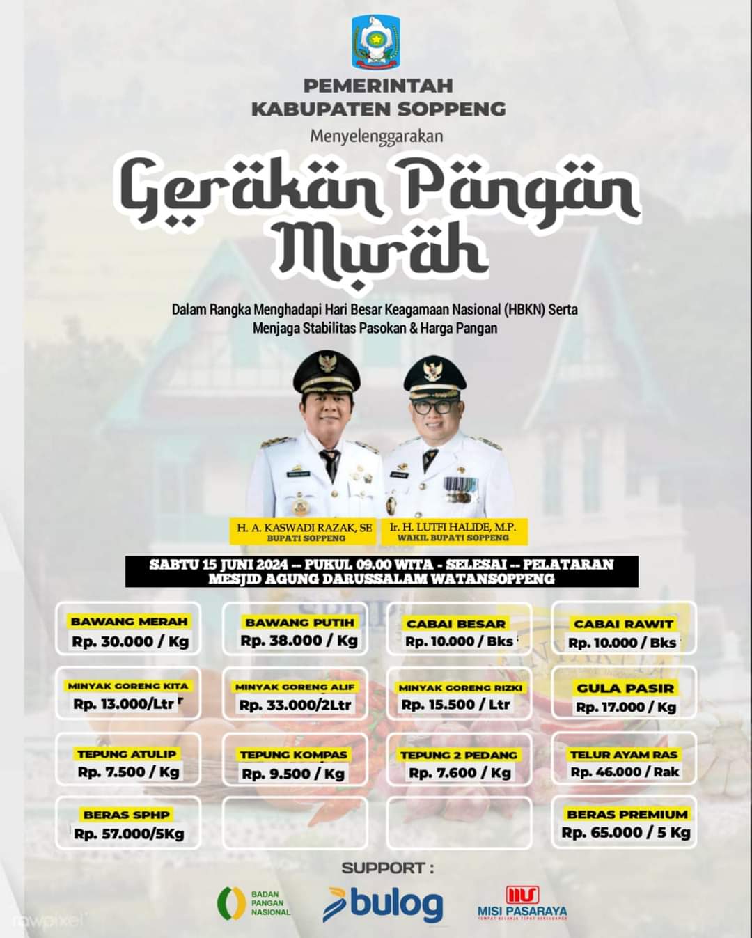 Soppeng, onlinekasus.com – Dalam rangka menyambut Hari Besar Keagamaan Nasional (HBKN), Pemerintah Kabupaten Soppeng melaksanakan “Gerakan Pangan Murah” pada Sabtu, 15 Juni 2024. Acara ini dimulai pukul 09.00 WITA dan bertempat di Pelataran Masjid Agung Darussalam Watansoppeng.