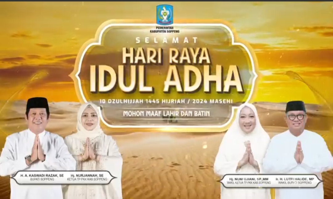 Soppeng, onlinekasus.com – 10 Dzulhijjah 1445 H / 2024 M – Pemerintah Kabupaten Soppeng beserta segenap jajarannya mengucapkan Selamat Hari Raya Idul Adha atau yang juga dikenal dengan Hari Raya Kurban. Dalam momen yang penuh berkah ini, kami mengucapkan Taqabbalallahu Minna wa Minkum, Minal Aidin Wal Faizin, Mohon Maaf Lahir Batin.