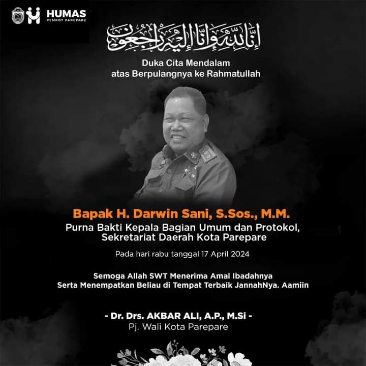 Penjabat Wali Kota Parepare, Akbar Ali, atas nama Pemkot Parepare menyampaikan duka cita mendalam atas kepergian almarhum yang di kenal bersahaja, ramah dan mudah bergaul ini. Innalilahi wainnailaihi rojiun, turut berdukacita atas berpulangnya Almarhum H. Darwis Sani, S.Sos., M.M. Purna Bakti Kepala Bagian Umum dan Protokol, Sekretariat Daerah Kota Parepare.