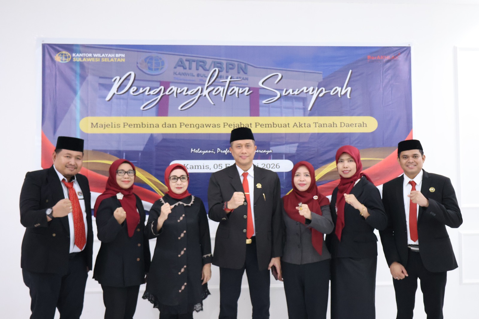 Soppeng – Kantor Pertanahan Kabupaten Soppeng melaksanakan kegiatan pengangkatan sumpah Majelis Pembina dan Pengawas Pejabat Pembuat Akta Tanah (PPAT) Daerah pada Kamis, 5 Februari 2026. Kegiatan ini berlangsung di Aula Latemmamala Kantor Pertanahan Kabupaten Soppeng.
