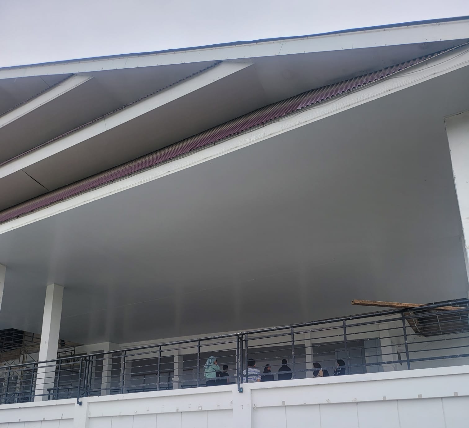 Dari rencana awal sudah sesuai dengan RAB memakai plafon penutup gypsun, tetapi tidak bertahan lama akhirnya jatuh karena melihat kondisi dengan bentangan 40 M dengan Lebar 12 M tidak cocok pemilihan material dengan menggunakan penutup Gypsun karena dia terlalu berat. dengan kondisi gedung yang Tidak memakai dinding dan berpengaruh kalau ada angin sampai gpysunx bergetar. Olehnya itu supaya tidak Terulang kembali kami koordinasi dengan PPK untuk mengganti plafon yg ringan yaitu PVC. ujar pihak pelaksana saat dihubungi media ini.