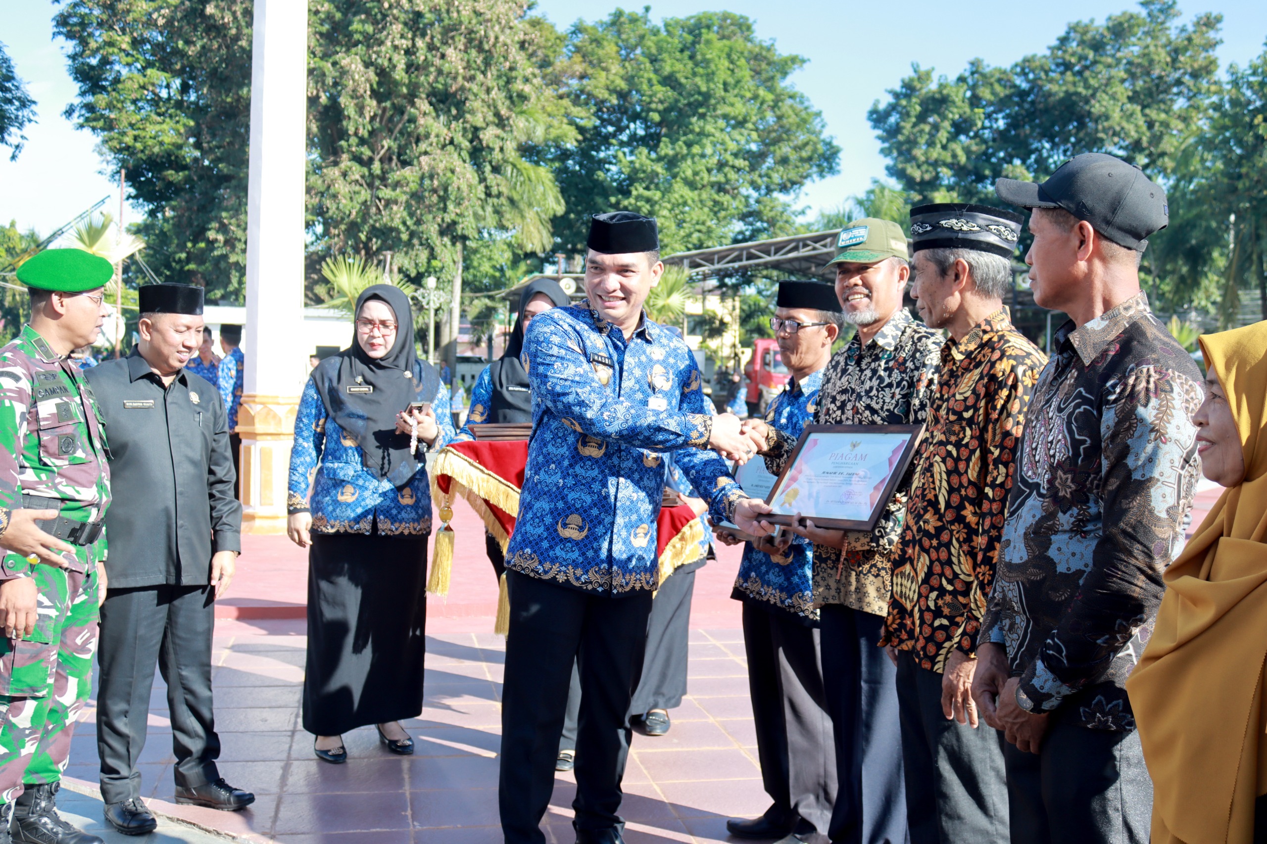 Diakhir upacara, dilanjutkan penyerahan piagam penghargaan kepada masyarakat atas kontribusinya sebagai tuan rumah pemondokan kafilah MTQ ke-XXXIII tingkat provinsi sulawesi selatan tahun 2024 yang diserahkan oleh Sekda Takalar H. Muh. Hasbi, S.STP. M.AP selaku Ketua Panitia MTQ XXXIII Tk. Prov. Sulsel Tahun 2024